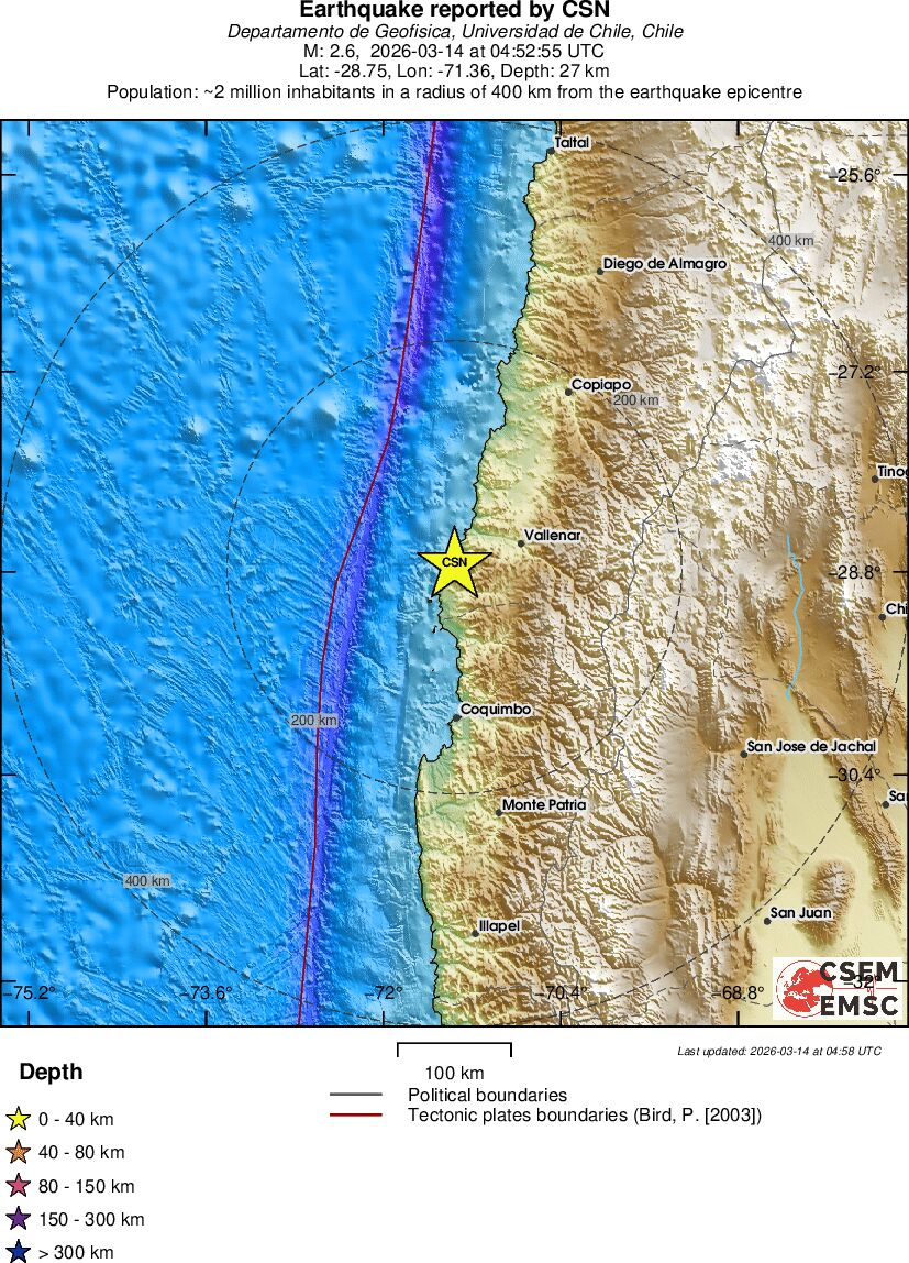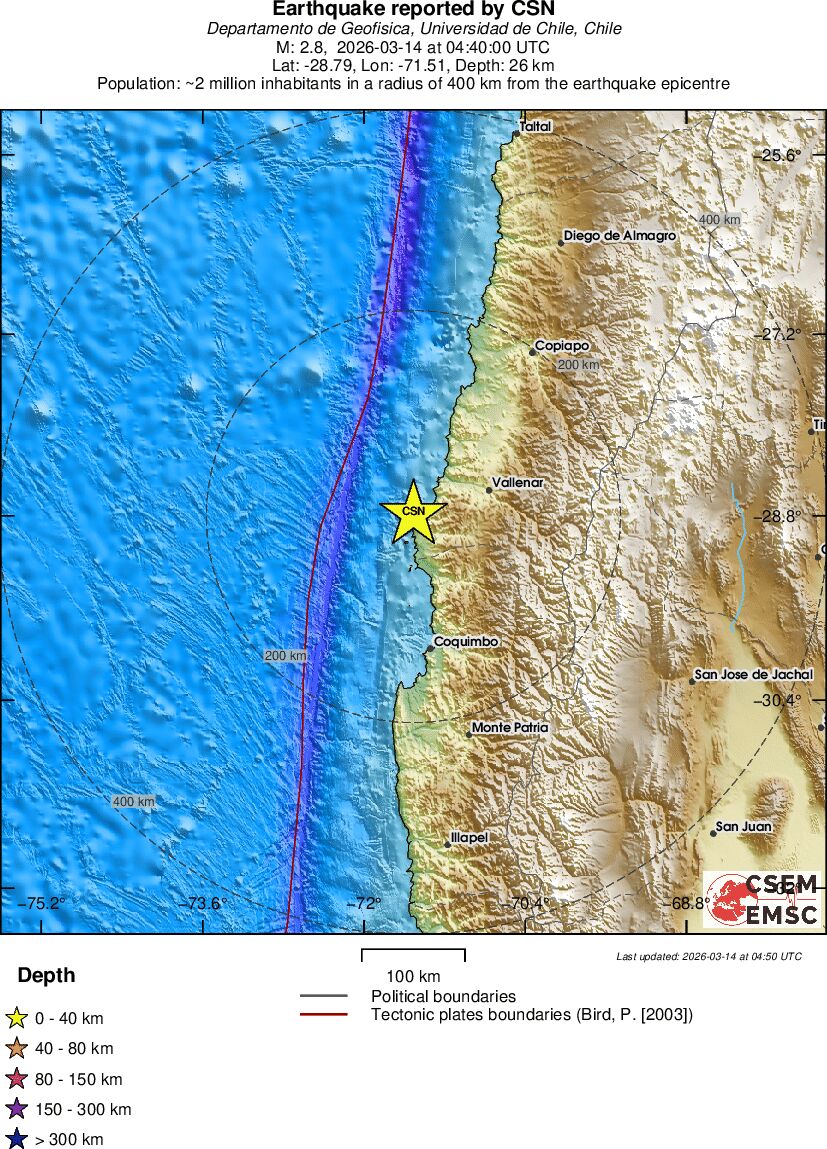 | 2.8 | 25.5 | 11608 | 05:40 | Link | Minor Earthquake - OFFSHORE ATACAMA, CHILE - Today |