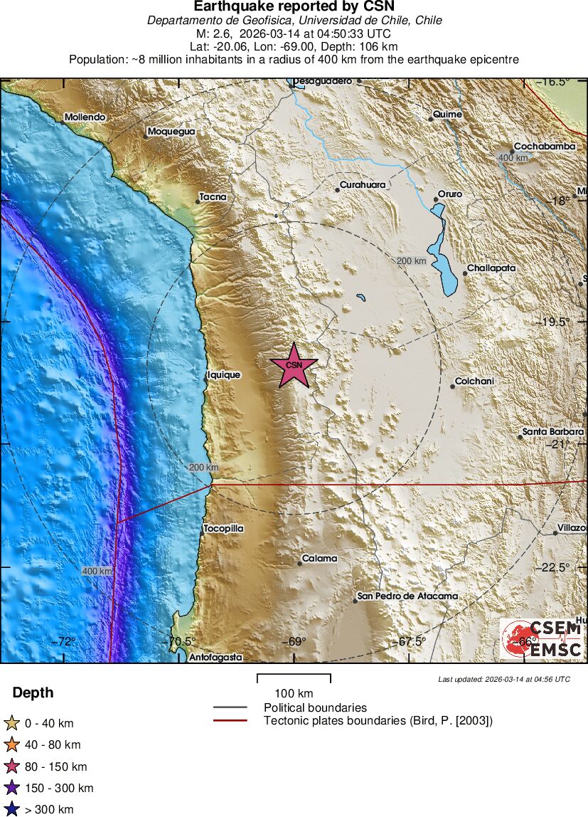 | 2.6 | 106.3 | 10735 | 05:50 | Link | Minor Earthquake - TARAPACA, CHILE - Today |