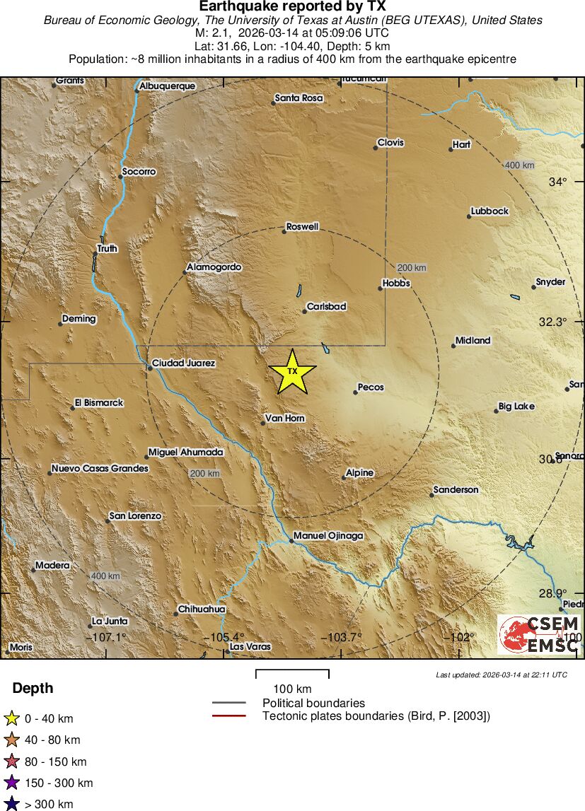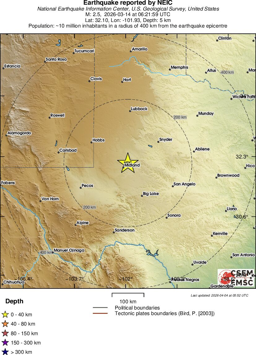 | 2.1 | 4.1 | 9130 | 06:09 | Link | Minor Earthquake - WESTERN TEXAS - Today |