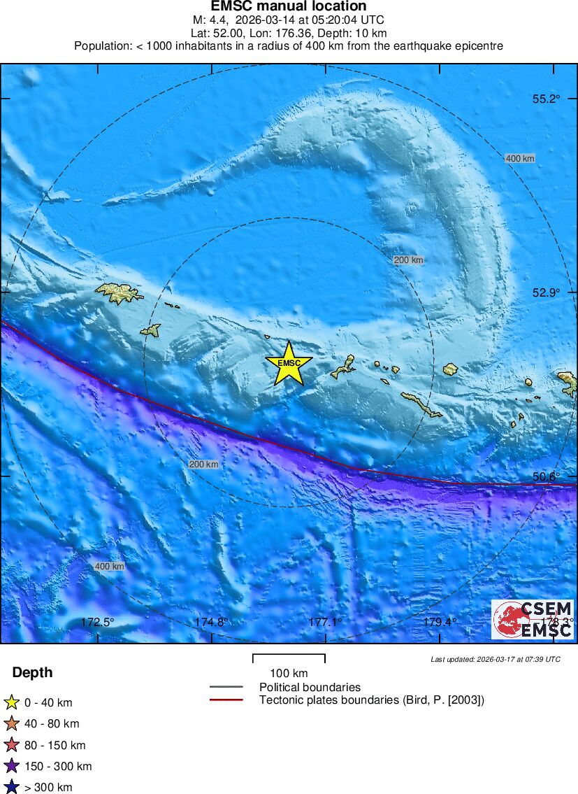 | 4.4 | 10 | 9056 | 06:20 | Link | Light Earthquake - RAT ISLANDS, ALEUTIAN ISLANDS - Today |
