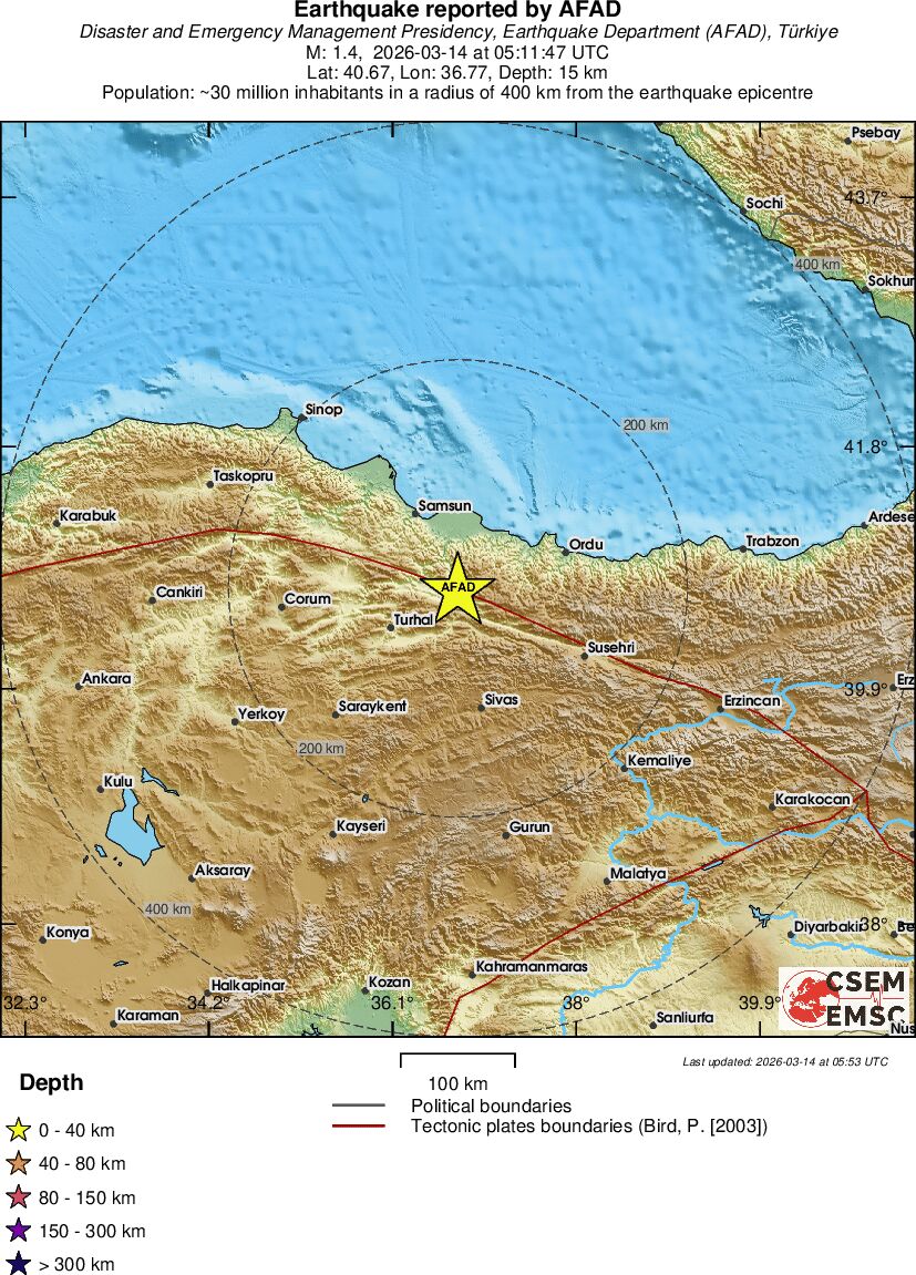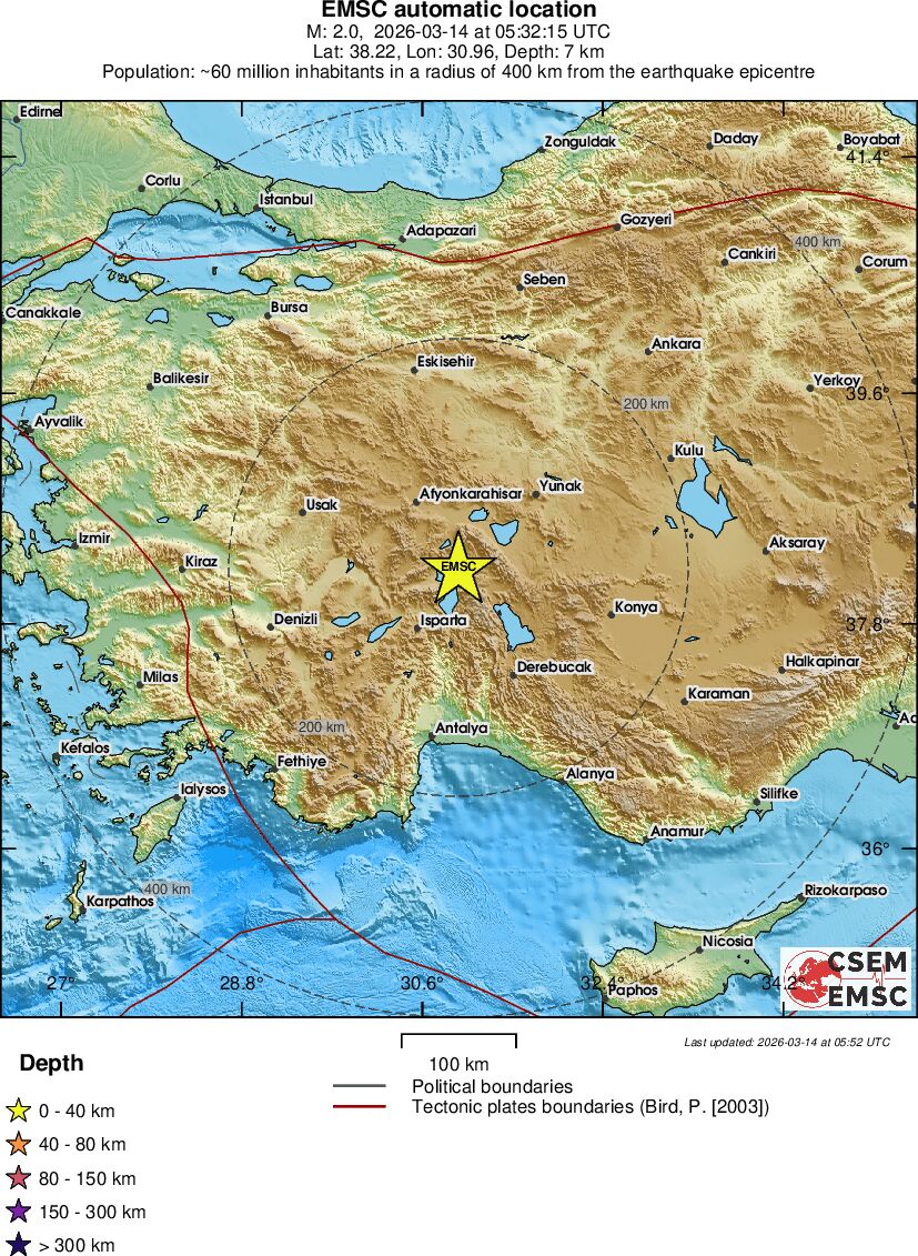 | 1.4 | 14.9 | 2282 | 06:11 | Link | Minor Earthquake - CENTRAL TURKEY - Today |