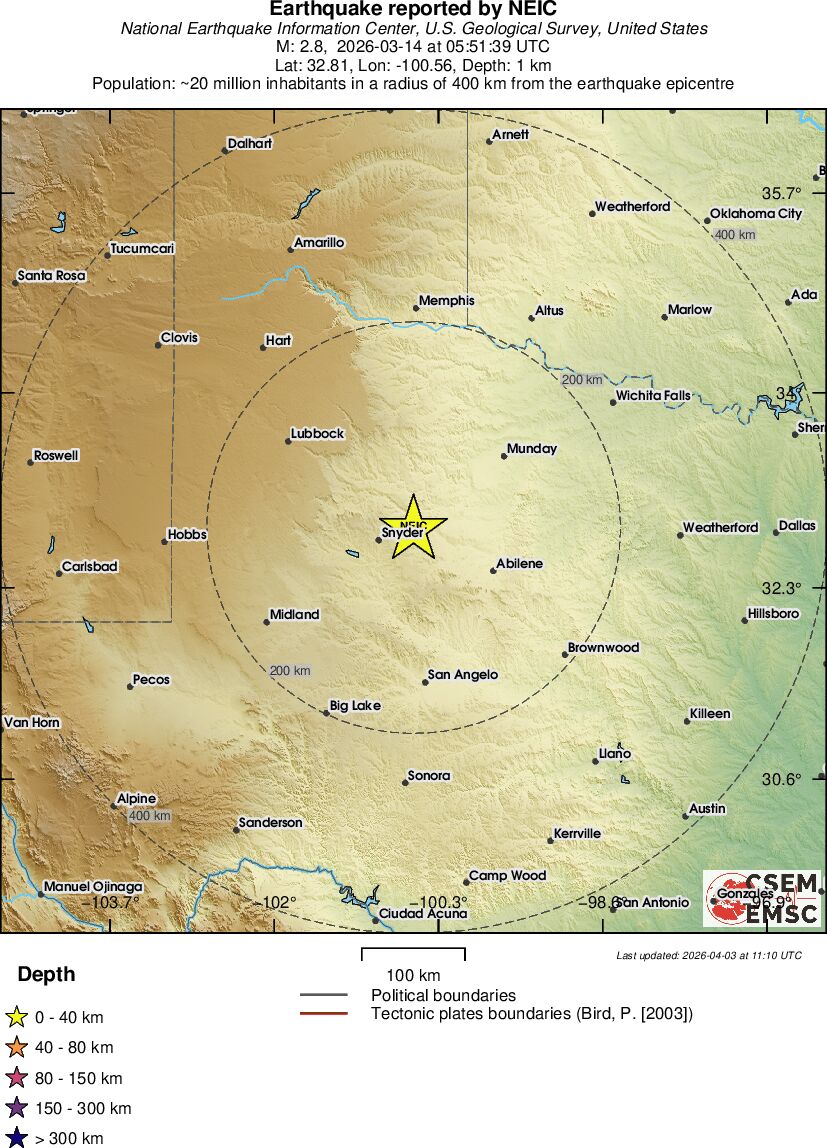 | 2.8 | 4.6 | 8795 | 06:51 | Link | Minor Earthquake - WESTERN TEXAS - Today |