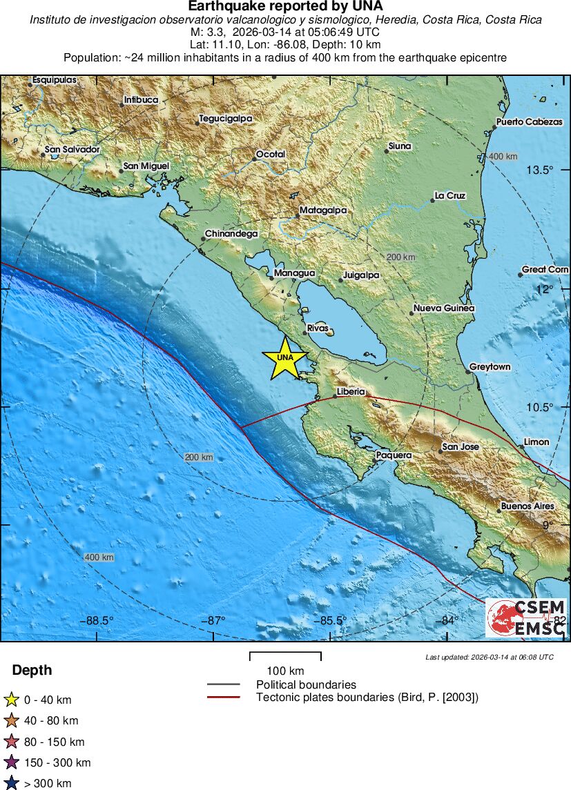 | 3.3 | 10 | 9539 | 06:06 | Link | Minor Earthquake - NEAR COAST OF NICARAGUA - Today |