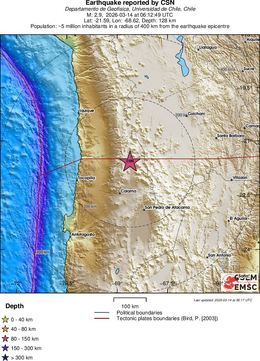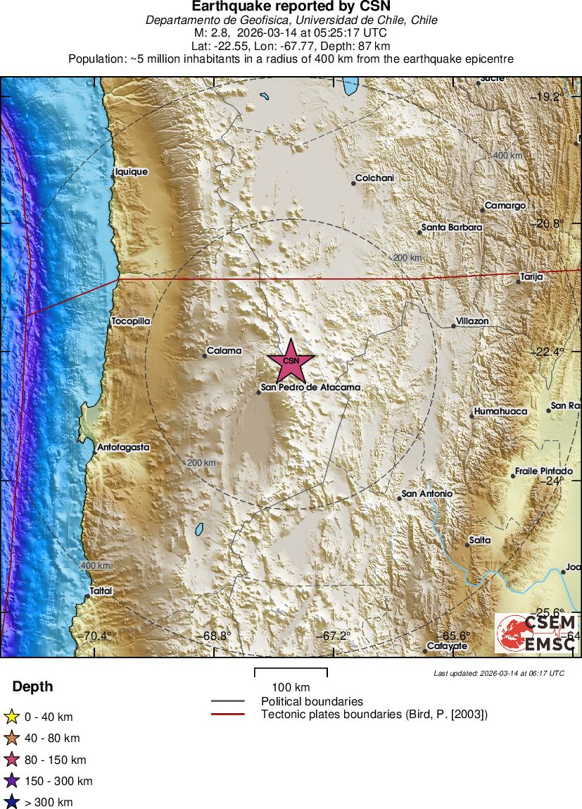 | 2.6 | 27 | 11594 | 05:52 | Link | Minor Earthquake - ATACAMA, CHILE - Today |