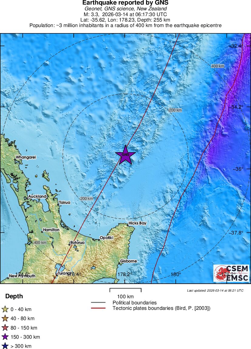 | 3.3 | 255.1 | 18545 | 07:17 | Link | Minor Earthquake - OFF E. COAST OF N. ISLAND, N.Z. - Today |