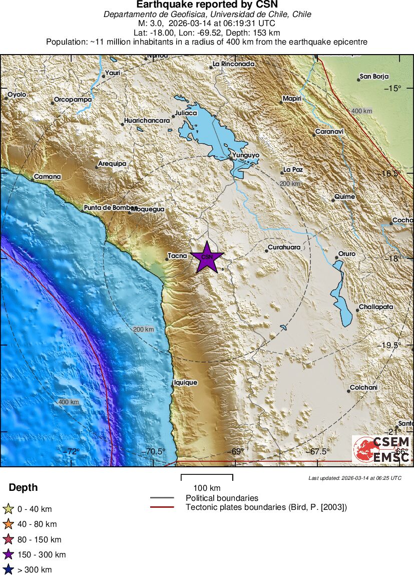| 3 | 153.4 | 10606 | 07:19 | Link | Minor Earthquake - TARAPACA, CHILE - Today |