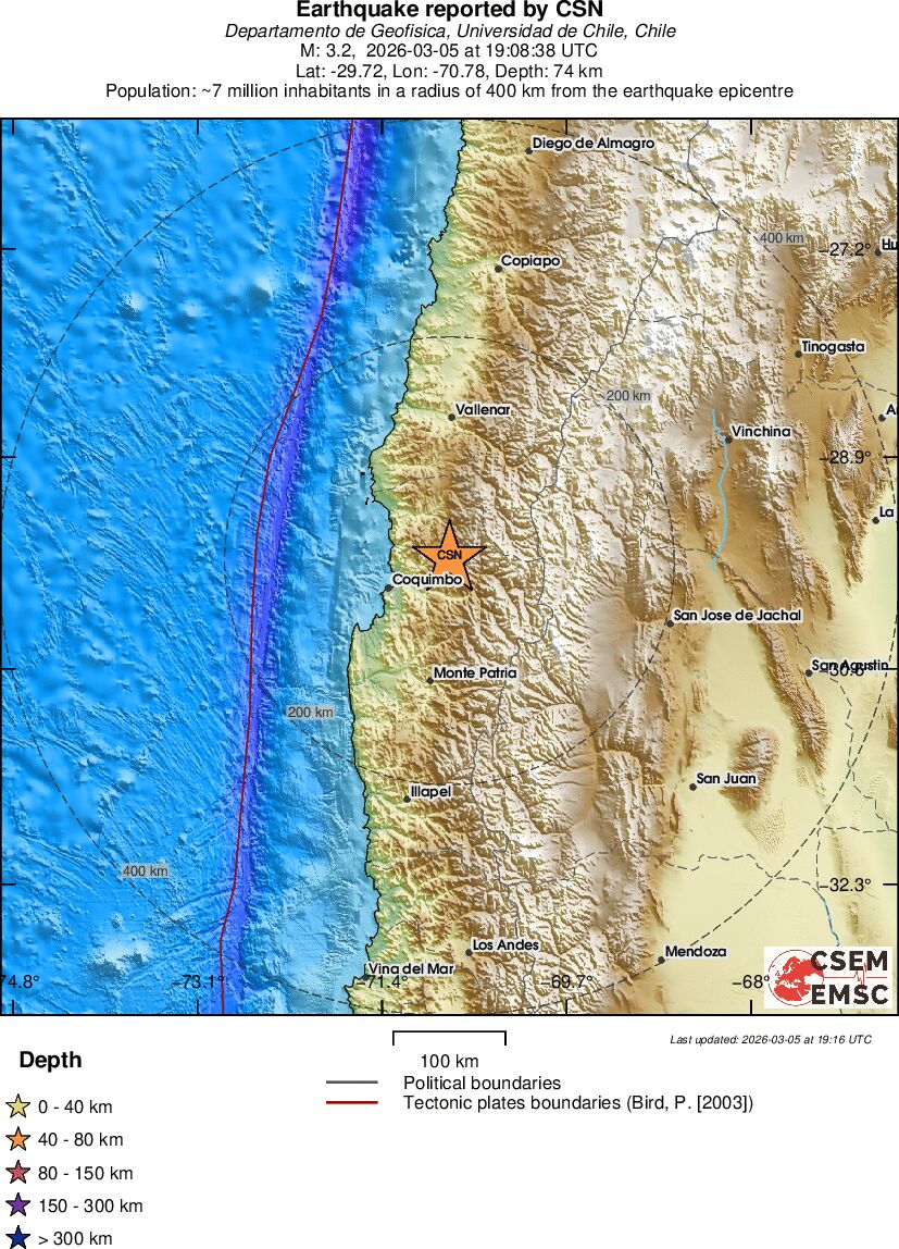 | 3.2 | 73.8 | 11630 | 20:08 | Link | Terremoto menor - COQUIMBO, CHILE - Hoje |