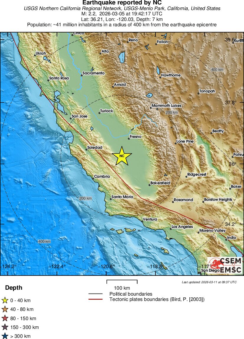 | 2.2 | 7.5 | 9579 | 20:42 | Link | Terremoto menor - CENTRAL CALIFORNIA - Hoje |