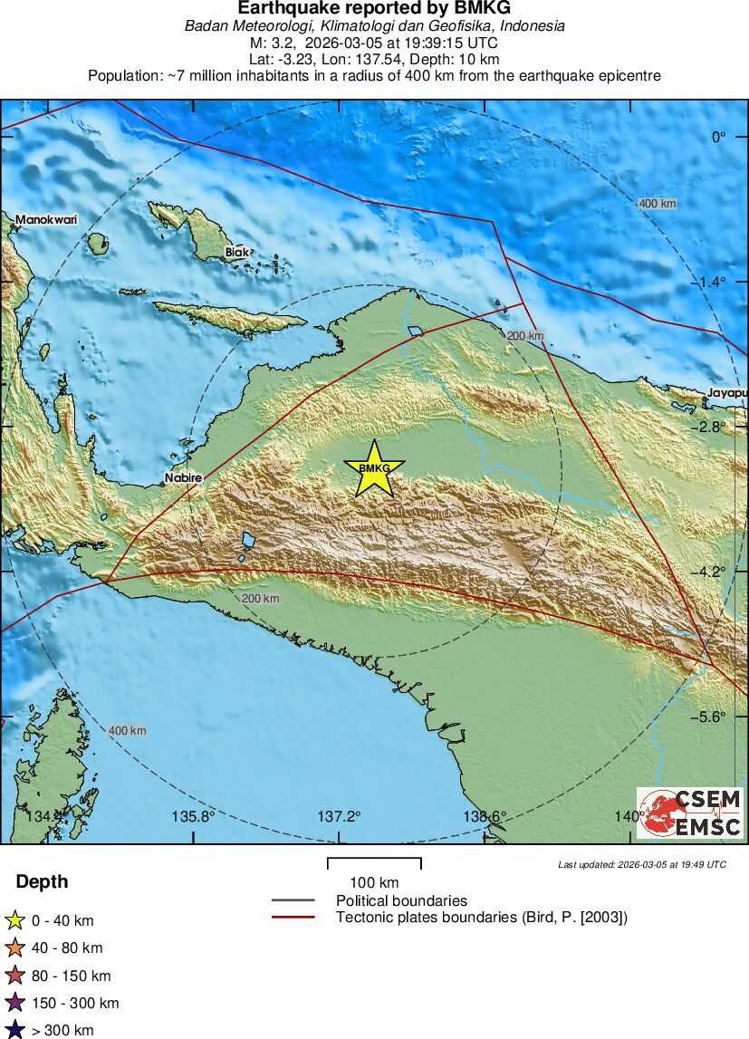 | 3.2 | 10 | 13128 | 20:39 | Link | Terremoto menor - PAPUA, INDONESIA - Hoje |