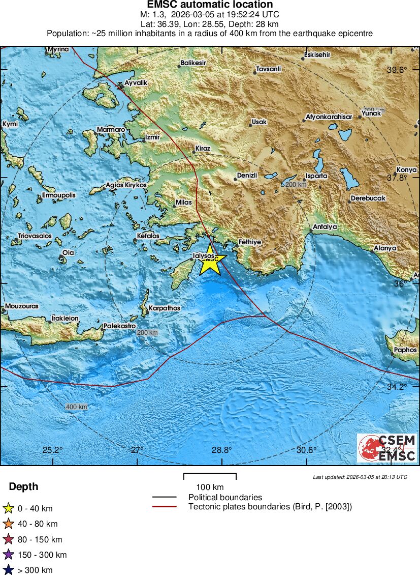 | 1.3 | 28.3 | 1914 | 20:52 | Link | Terremoto menor - DODECANESE IS.-TURKEY BORDER REG - Hoje |