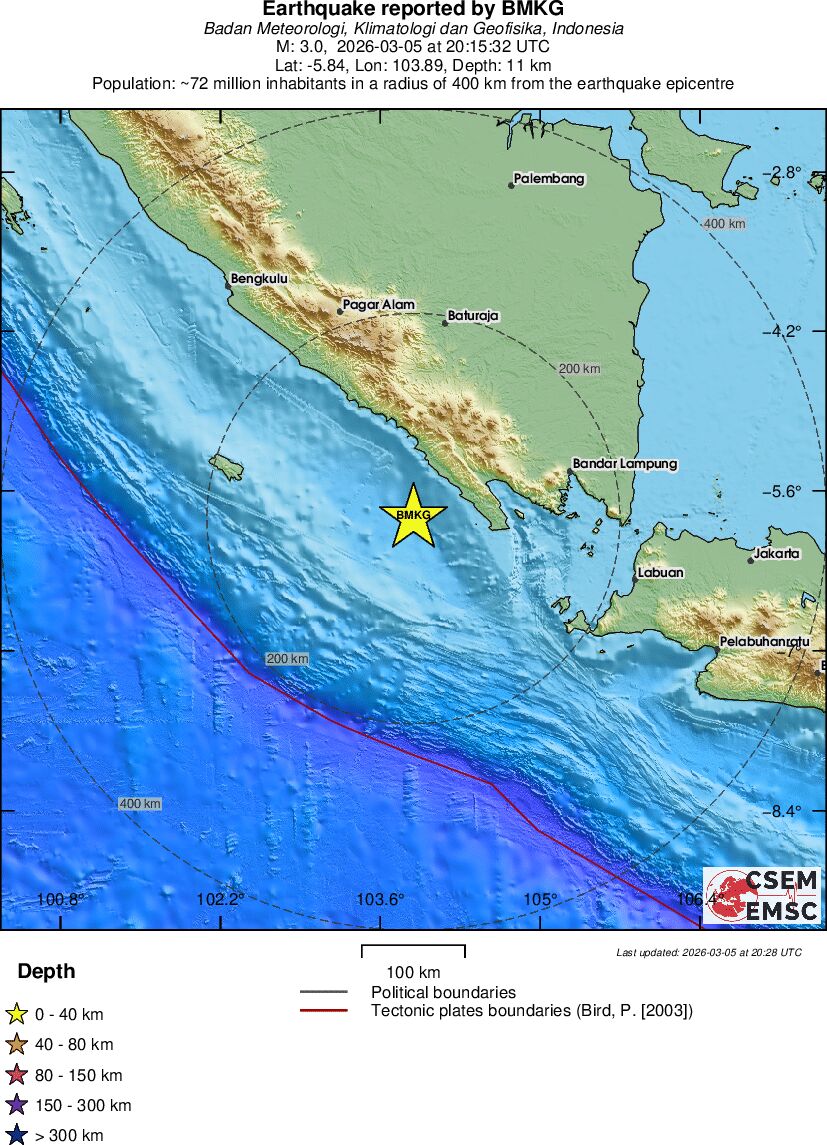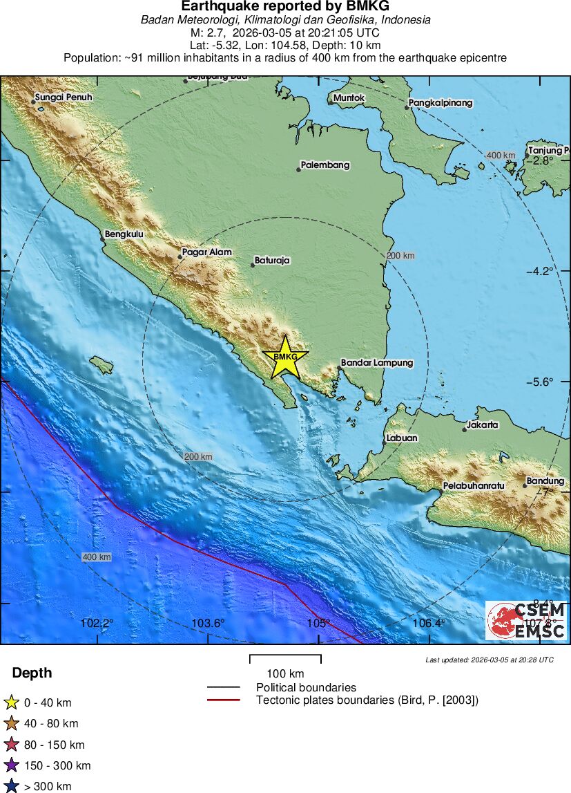 | 2.7 | 10 | 10836 | 21:21 | Link | Terremoto menor - SOUTHERN SUMATRA, INDONESIA - Hoje |
