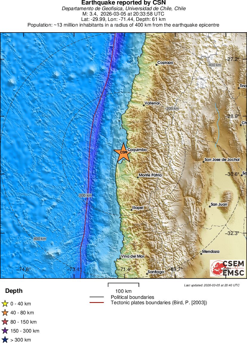 | 3.4 | 61.2 | 11697 | 21:33 | Link | Terremoto menor - OFFSHORE COQUIMBO, CHILE - Hoje |