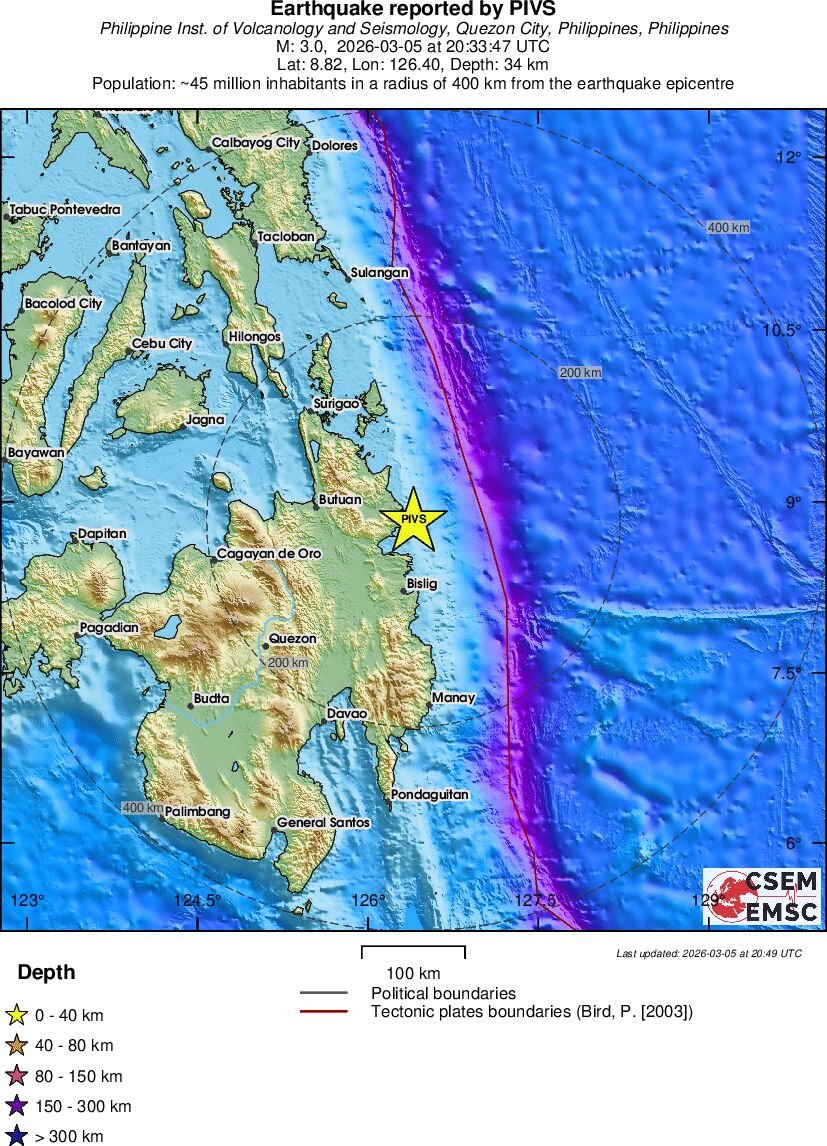 | 3 | 34 | 11310 | 21:33 | Link | Terremoto menor - MINDANAO, PHILIPPINES - Hoje |
