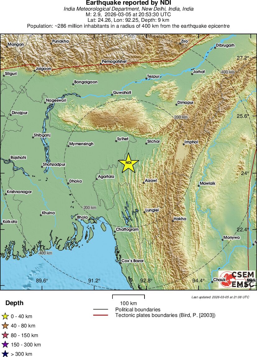 | 2.9 | 9 | 7570 | 21:53 | Enllaç | Terratrèmol menor - INDIA-BANGLADESH BORDER REGION - Avui |