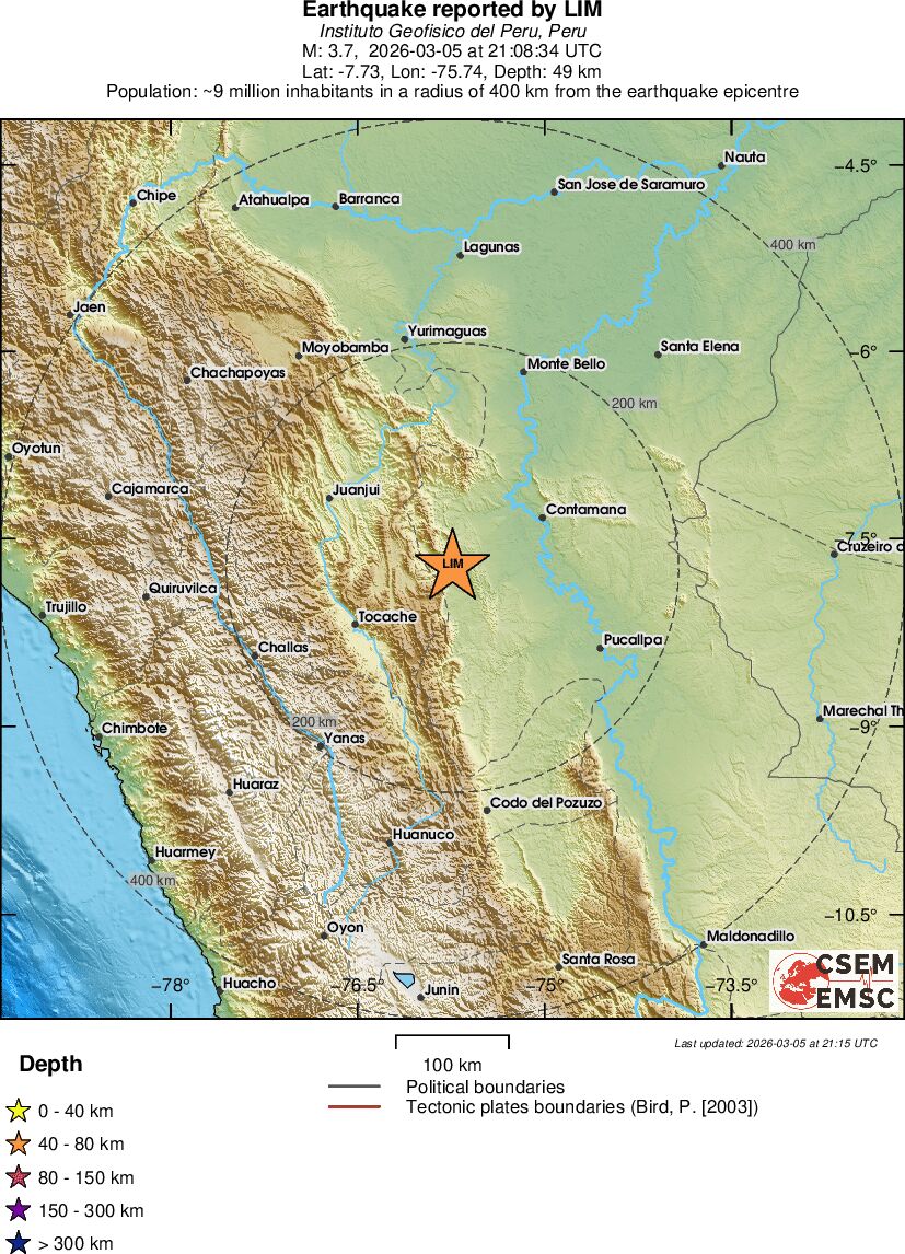 | 3.7 | 49 | 10246 | 22:08 | Enllaç | Terratrèmol menor - NORTHERN PERU - Avui |