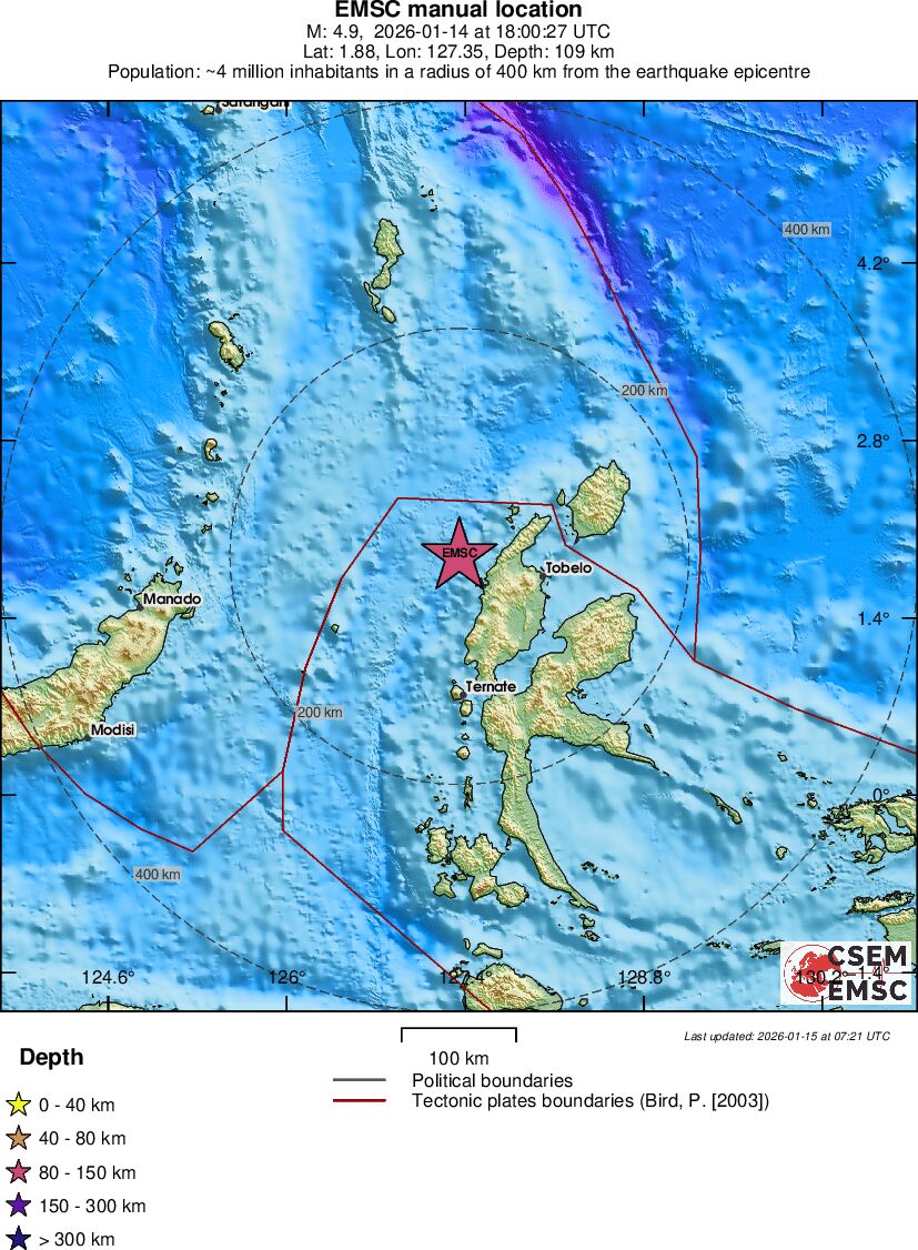 | 4.9 | 112.1 | 7440 | 19:00 | Link | Let jordskælv - HALMAHERA, INDONESIA - I dag |