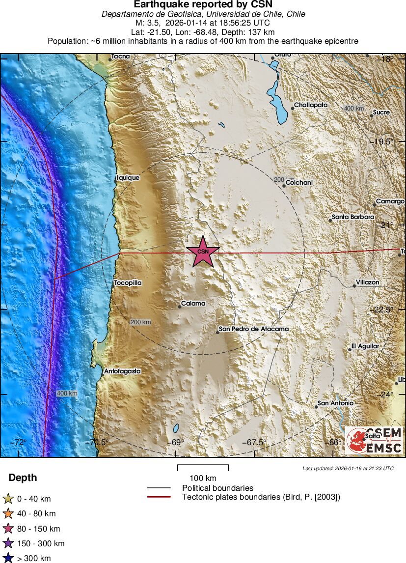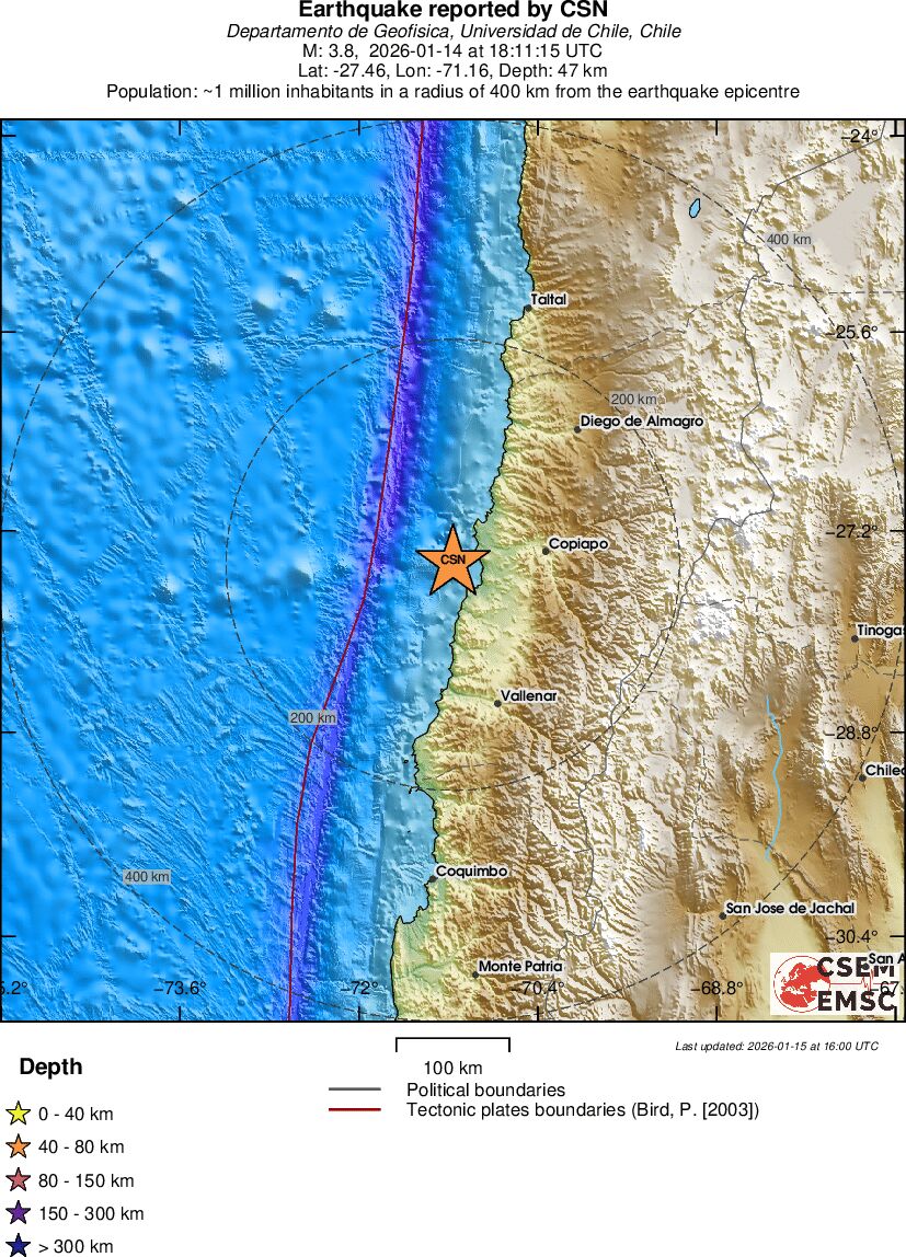 | 3.8 | 47.9 | 7132 | 19:11 | Link | Mindre jordskælv - OFFSHORE ATACAMA, CHILE - I dag |