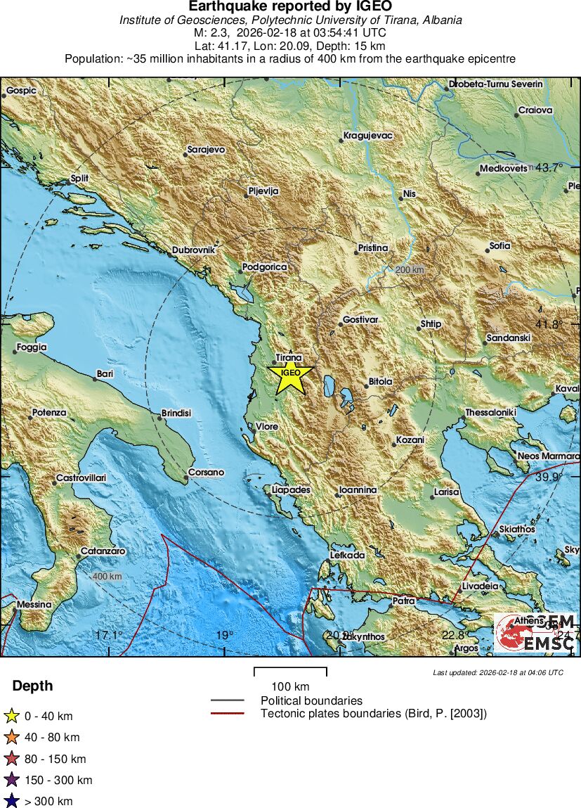 | 2.3 | 15 | 1008 | 04:54 | Enlace | Terremoto pequeño - ALBANIA - Hoy |