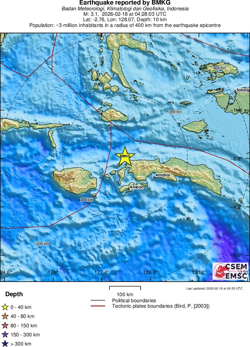 | 3.1 | 10 | 12415 | 05:28 | Enlace | Terremoto pequeño - CERAM SEA, INDONESIA - Hoy |