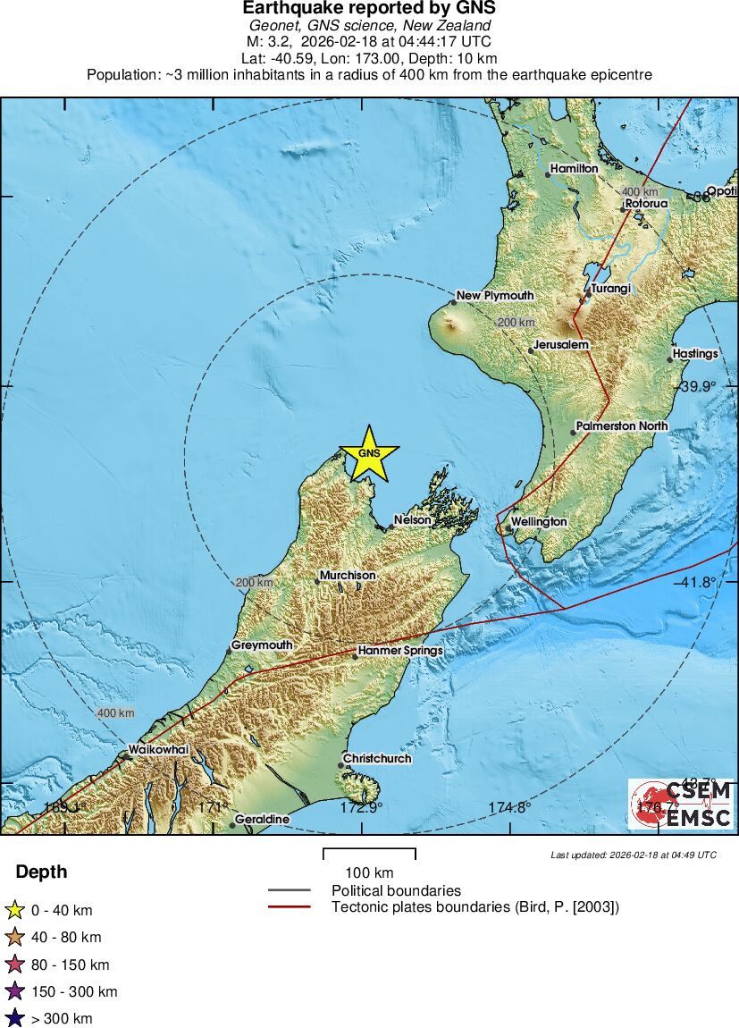 | 3.2 | 10 | 18570 | 05:44 | Enlace | Terremoto pequeño - OFF W. COAST OF S. ISLAND, N.Z. - Hoy |