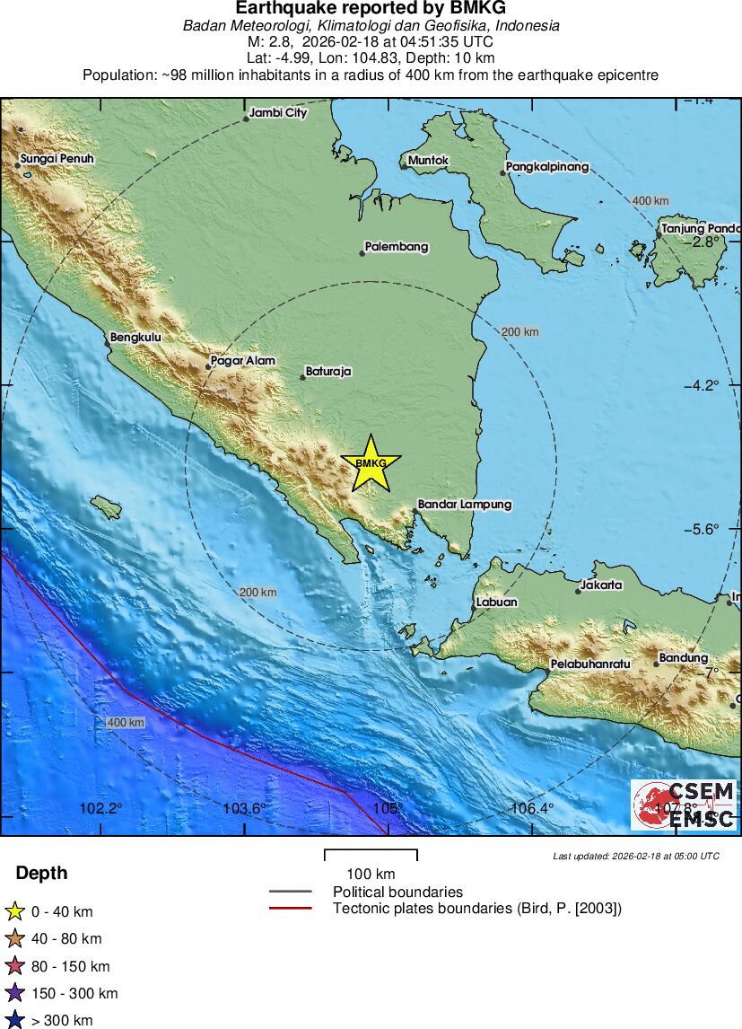 | 2.8 | 10 | 10830 | 05:51 | Enlace | Terremoto pequeño - SOUTHERN SUMATRA, INDONESIA - Hoy |