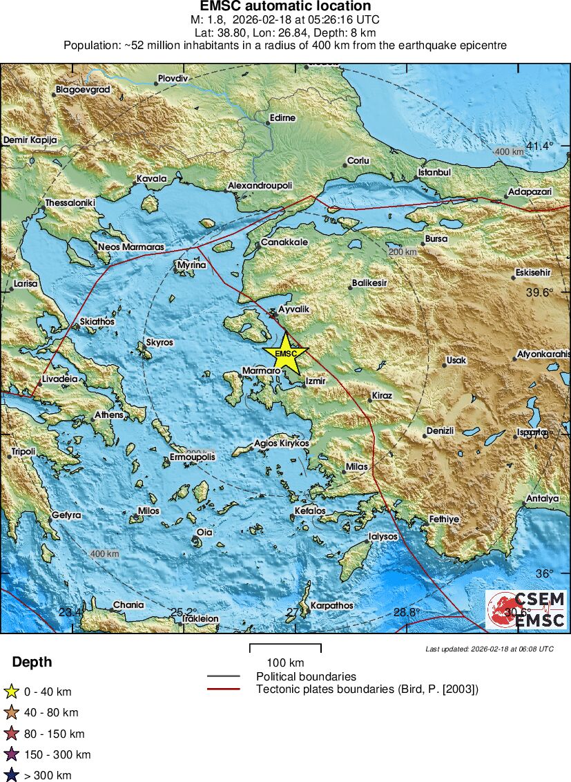 | 1.8 | 8.2 | 1633 | 06:26 | Enlace | Terremoto pequeño - NEAR THE COAST OF WESTERN TURKEY - Hoy |