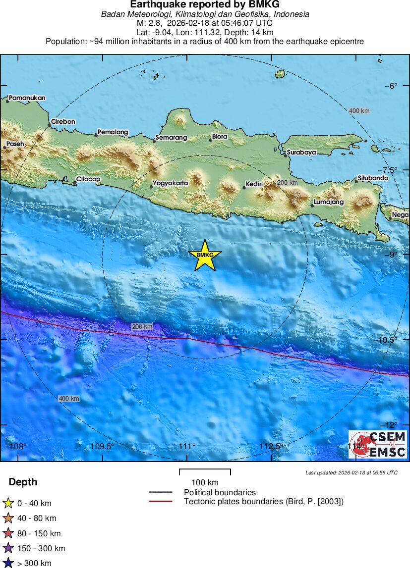 | 2.8 | 14 | 11653 | 06:46 | Enlace | Terremoto pequeño - SOUTH OF JAVA, INDONESIA - Hoy |